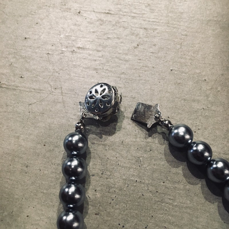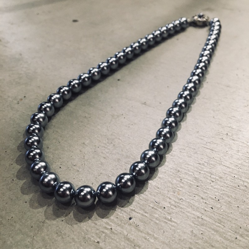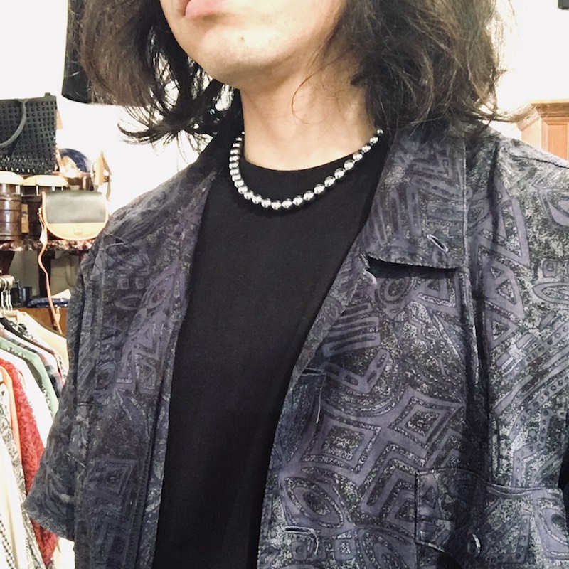 商品説明 重厚な金属色のシルバーパールネックレス。黒T等と合わせると今っぽい雰囲気に。